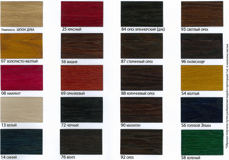 25 – огненно-красный ; 56 - вишня ; 69 – оранжевый ; 72 – черный ; 76 - венге ; 84 – орех Бреннерский ; 87 – старинный орех ; 88 – коричневый орех ; 90 – красное дерево (махагон) ; 92 –орех ; 93 - светлый орех ; 96 – палисандр (розовое дерево) ; S4 – желтый ; S6 – голубой Эльба ; S8 – зеленый
